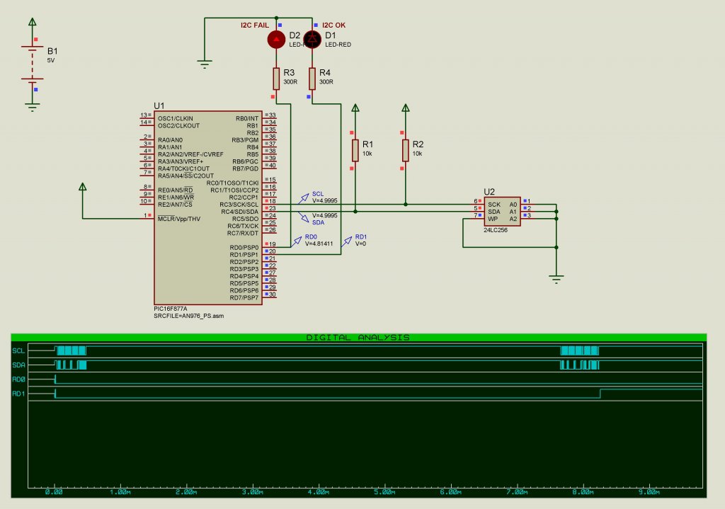 Most ismerkedem az I2C kommunikációval, és az AN976-ost alapul véve , azt módosítottam úgy hogy csupán byte írás és byte olvasás legyen, a végén összehasonlítással, majd egy-egy LED jelezné a meg ill. nem megfelelőséget. Itt aztán elekadtam mert a szimulátorban /Protel/ folyamatosan a hibás LED világít és nem tudok rájönni hogy hol lehet a hiba ! Az MPLAB-ban látszólak jól működik ha én módosítom a regisztereket, nem tudom lehet-e máshogyan ezt szimulálni. Megépítettem próbapanelon gondolván hogy majd a PicKit2 Logic Tool-jával megmérem a jeleket /a 4,7 k-s lehúzó ellenállásokat kiszedtem a bemenetről/, hátha sikerül megoldanom a problémát de egyszerűen nem tudom pl. az SSPBUF-ba mi kerül stb. stb. ! Kérlek benneteket hogy fussátok át a kódomat hátha valami kopasz hibát vétettem benne ! Előre is köszi mindenkinek ! PS.