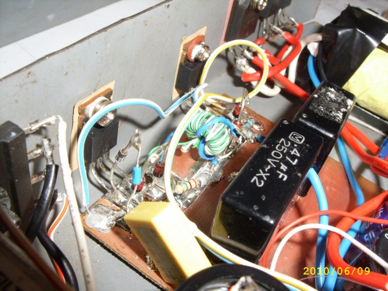 Ez egy egyedi darab, egy kedves fórumtársnak, így se nyák, se túllihegett alkatrészelhelyezés nem volt fontos, csupán a teljesítmény. Üresjárati feszültség: 25.2V, terhelve: 24.3V@4A, 22.8V@8A, ami szerintem olyan, mint ha szabályzott volna, bőven megfelel a célnak. A lágyindítás még a be-ki kapcsolót se veszi túlzottan igénybe, egy kis módosítással majdnem 1mp-cel a feszültség alá helyezés után indul be az oszcilláció. f=93kHz@0A, 85kHz@2A, észlelhető disszipáció lényegében csak a kimeneti egyenirányítókon jelentkezik csekély mértékben. (A lefényképezett lemezház el tudja vezetni névleges terhelés mellett is a ház <40°C hőmérséklete mellett).