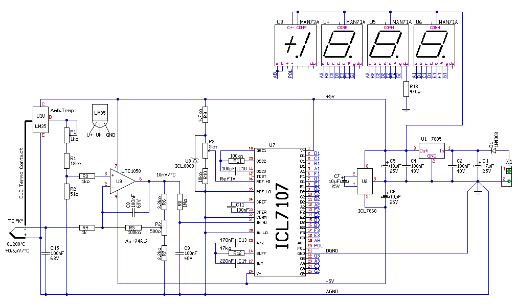 Elkészítettem a rajzot. LM35-öt tettem bele. Beállítani úgy kell, hogy először nem ültetjük be a 12kohm-os ellenállást. - A hőelem bemenetre, akkora feszültséget adunk, hogy az IC kimenetén 1,999V legyen. (kb. -8..9mV) Majd referencia potival, a DVM mutatott értékét P3-al 199,9 fokra kell beállítani. - Majd a hőelem bemenetre, -8,12mV-ot kapcsolva, a P2-vel ismét 199,9 fokra állítjuk. - Rákapcsolva a hőelemet, és visszatéve a 12kohm-ot, a P1 potival a környezeti hőmérsékletnek megfelelő értéket állítunk be a kijelzőn. (közben a hőelemet nem tapizzuk.) - Ez után lehet kalibrálni a mérést. 0 fokon (kevert olvadt jégben) P1-el, és 100fokon forrásban lévő vízzel P2-vel. Kalibrációt iterációval végezzük el. (Az LM35 tokjának, és a hőelem becsatlakozó pontjának, termikus kapcsolatban kell lenni. Mert ez alkotja a hidegpontot.) üdv! proli007