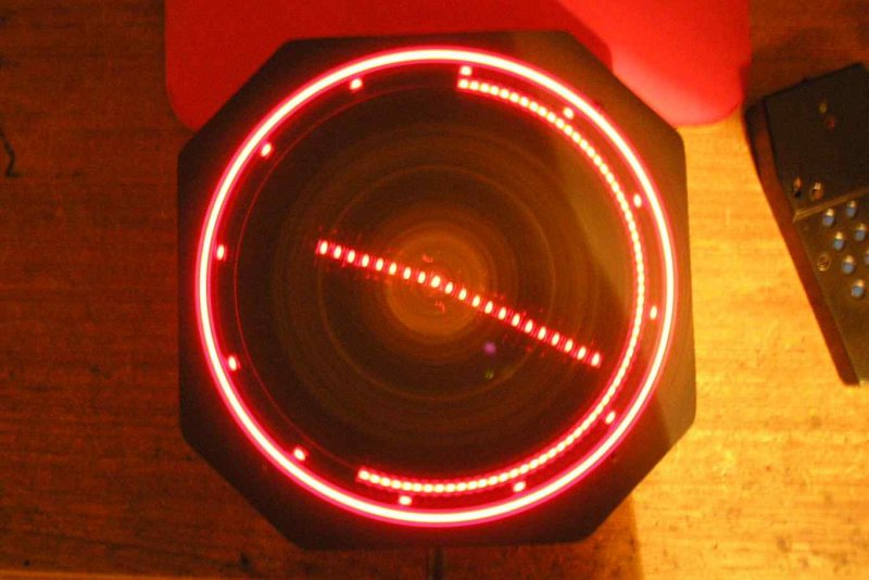 Új TSOP4836 van beépítve. Most írtam át URC22B-re a Keys.asm-et, csak 2 parancs, (LIGHTLIM_UP/LIGHTLIM_DN) nem fért már be, de ezzel sokkal gyorsabban tudom kezelni az órát. A telep diódáját rendben raktam, annak kötését nem is figyeltem előbb. Tesztelgetem tovább, de ez már így fog maradni, talán a külső kört cserélem majd kékre-zöldre. A propellert egy korábban elkészített bázisra építettem ideiglenesen, de lehet hogy ezen marad egy ideig. (Egy "fél fazékmagos" forgótrafóról üzemeltetem, ezt nagyon kicsiben is el lehetne készíteni). Világosban nagyon "sziporkáznak" a forrasztások, fénygyűrűk jelennek meg, azzal kell valamit még csinálni. Újabb képek az óráról.