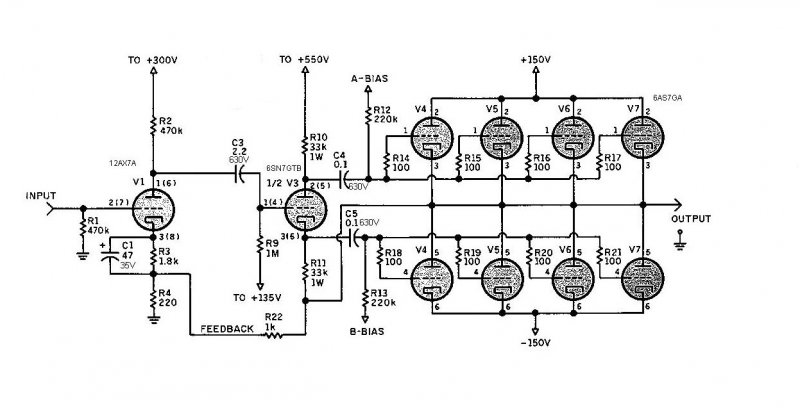 De nem is ez a baj. Egy katodinnal meghajtani 4 db párhuzamos triódát... A papír sokmindent elbír. Én mérnék egy frekimenetet a felső végcsövek rácsán. A katodin és triódák közé egy erős meghajtócső igencsak kívánkozik. Hogy ez anódkövető (ekkor eljutottunk a Williamson meghajtáshoz), vagy katódkövető (ami itt jobb lehet) azon el lehet elmélkedni.