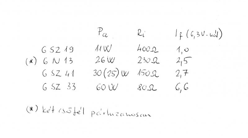 A kimenő teljesítményt első körben az anóddisszipáció határozza meg. (Pa) Az illesztő kimenőtrafó ellenállását a cső belső ellenálása (Ri) A táblázatból látható, csodák nincsenek. Mivel mind a 4 cső azonos felhasználásra készült, látható a hasonlóság. Innentől egyéni, hogy 6 db 6C19 vagy 1 db 6C33. Fűtésigény, belső ellenálás, anód disszipáció kb. azonos mindkét alternatívánál. Mondjuk én egy 10 W PP vagy 6W PSE-nél a 6C19-et választanám, mert össze tudom válogatni párba, kicsit kisebb meghajtófesz kell. A 6N13 kicsit erősebb, de ott a két csőfél adott a búrán belül. Nagyobb teljesítménynél meg szigorúan a 6C41 vagy 6C33 a sok párhuzamos cső alkalmazása helyett.