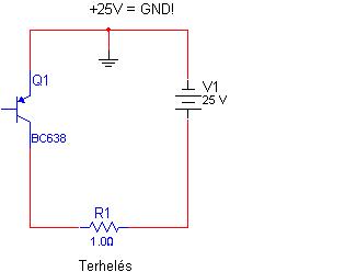 Így a terhelés a 0V - ot kapja fixen és a tranzisztor a másik lábát felhúzza +25V-ra ha a bázisa az emmiterhez képest nyitófeszültséget kap.