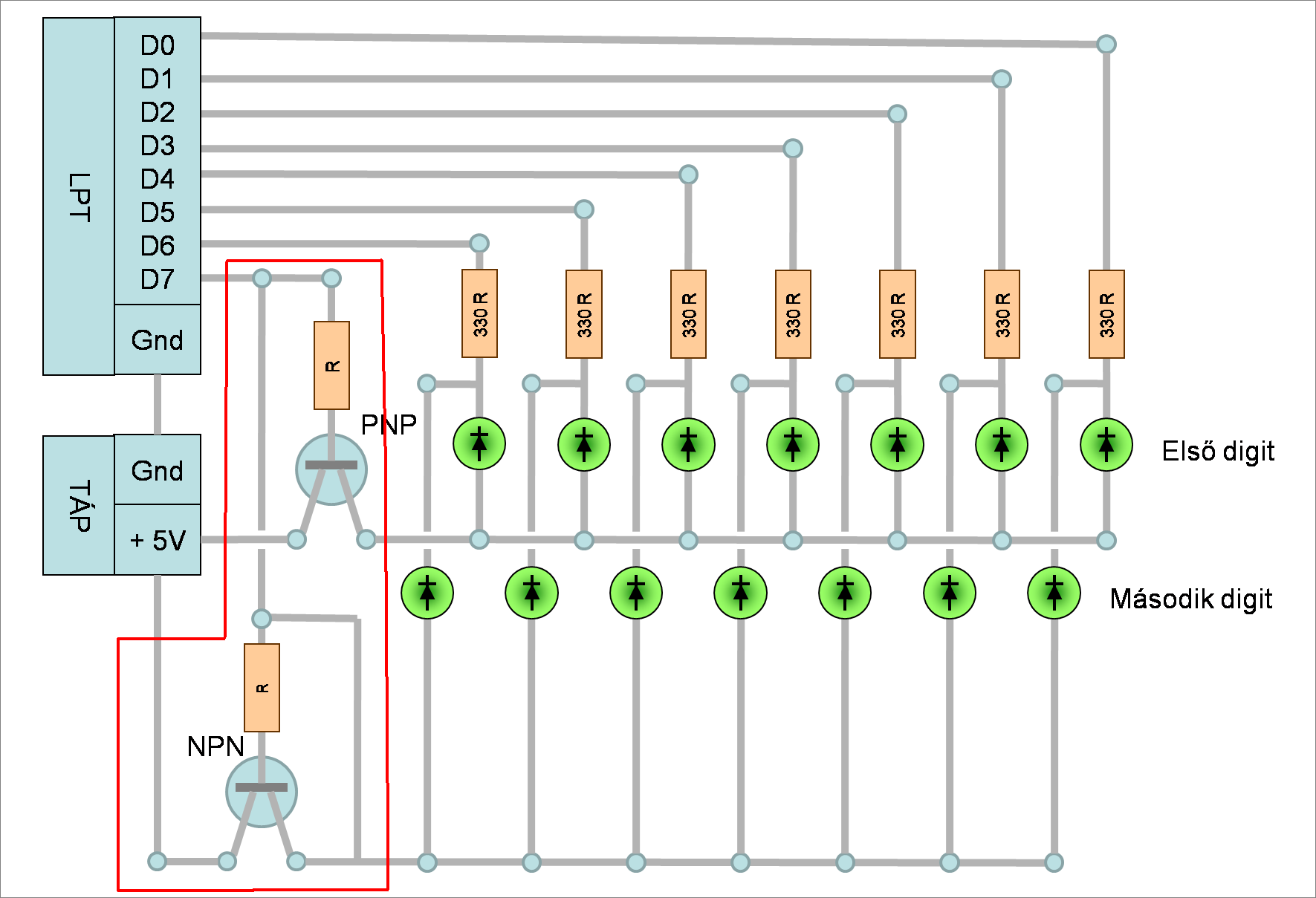 Le tudnál rajzolni egy hasonló áramkört, mint amit én is mellékeltem, csak olyat ami működik? Hogy "még jobban" értsem a dolgot... És ha valahogy megoldanám, hogy kevesebb áram jöjjön ki az LPT-ből, akkor nem is kéne invertálni a vonalakat? Esetleg át tudnád rajzolni a bekeretezett részt?