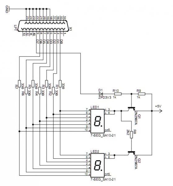 Szoval problema a szek es a szamitogep kozott van . Meg kellene ismerni az alap elektronikat! A rajzon en egy altalanos 7 szegmenses kijelzot rajzoltam aminek 2 anodja van, megpedig a 3. es a 8. labon (kozonseges es altalanos bekotes) . Termeszetesen ha a tied nem ilyen, at kell alakitani a kapcsrajzot annak megfeleloen. A tranyok vegul is barmilyenek lehetnek, ha elbirjak a kijelzok aramat. A bazisellenallas erteke nem valtozik termeszetesen, mert a tranyokat kapcsolo uzemmodban hasznaljuk. Ajanlom hogy olvass sokat az alap elektronikarol, ha ezzel akarsz foglalkozni. Utana sok mindent meg fogsz erteni.