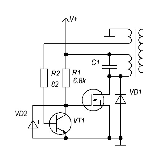 ... viszont a primér és C1 által alkotott rezgőkört jelentősen söntöli VD1 ill. a fet diódája, így nem nevezhető rezonánsnak.