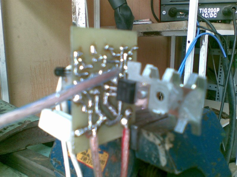 Aztán elkezdtem variálni a komparátor ellenállásaival és egyszercsak egy gyönyörű háromszögjel lett a shöntön de túl alacsony volt a frekvencia (kb 30hz).Megpróbáltam feltornázni de csak két állapot létezik.A begerjedt és a jó de alacsony frekvenciás állapot.És most figyelj.A két állapot között úgy tudok váltani hogy közelitem a kezem a fet hűtőbordája felé és egyszercsak megjavul.Ha megfogom megint gerjed,ha elveszem a kezem megint nem jó.Pont elkell találni a távolságot.AGYRÉM.