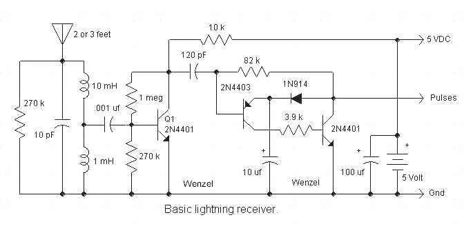 A rezgőkör kb. 300kHz-es hossszú hullámra van hangolva. Ez a hullámhossz érzékeny a légköri kisülésekre. A 270ko ellenállás kicsit rontja a rezgőkör Q-ját és egyben megakadályozza az oszcillációt. Antenna hossz nem kritikus 50-60 cm-es teleszkóp antenna megfelel. A Q1-es tranzisztor RF erősítöként üzemel, felerősíti a rezgőkörre érkező, villámlás által keltett impulzusokat. A felerősített jel 120pf-es kondenzátoron a Q2, Q3 tranzisztorokbol felépített monostabil mv. bemenetére kerül. Megfelelő nagyságú jel átbillenti a multit, Q3 kinyit bekapcsolja a lámpát vagy a ledet. Ebben az állapotban addig marad mig a 10 µF kinem sül. A módosítot rajzon 20k-os potival lehet az érzékenységet állítani. Ledek, lámpák, hangszóró illesztése és a módosított rajz a mellékelt linken megtalálható. A rezgőkört egy 40mm hosszú ferrit rúdra tekertem teljes hosszában 0.1mm cuz huzalból. Pontos freki és a rezgőkör jósága (Q) nem krtikus. Én a ledes megoldást választottam. Az áramkört elkészítettem, bár dobozolásra ill. komplettírozásra nem került még sor. Az áramkör nekem működött. Ha épp nincs zivatar, egy kis szikrát forszírozhatunk a készülék közelében, gondolom ez nem lesz műszaki probléma. További részletek itt: Link