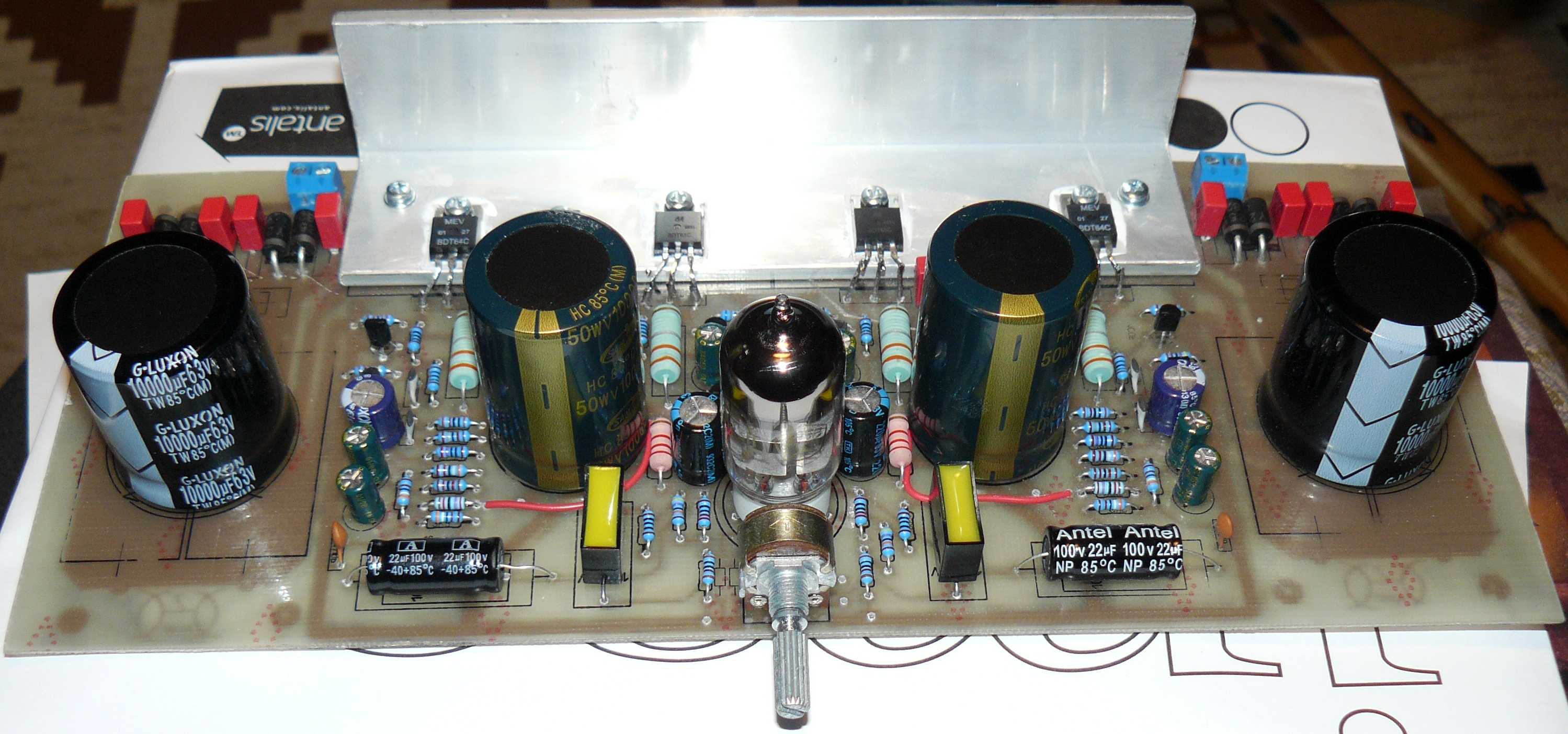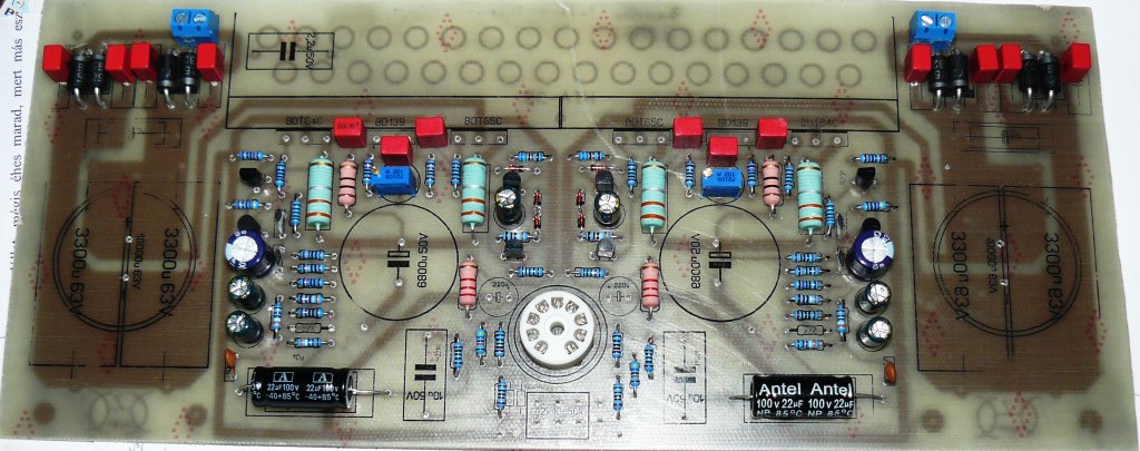 Elkészültem a beültetéssel. Még egy két dolog hiányzik (tápszűrő 2,2µF és berakok egy biztosítéktartót is az AC részhez). Most a látvány kedvéért egy 6n23p van benne. Még lemosom a panelt és kábelezgetek, utána kipróbálom.