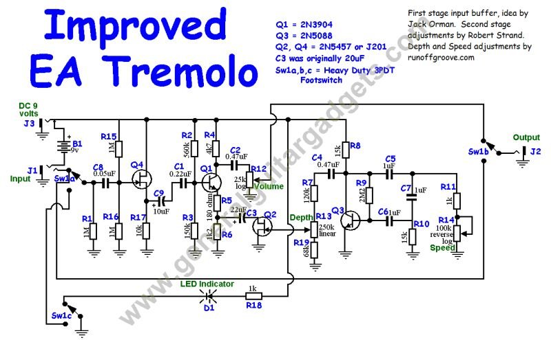 Megépítettem egy EA Tremolót az alábbi rajzok alapján. Találtam egy videót youtube-on, ahol egy srác modolva megépítette. Megkérdeztem miket csinált, de nem tudom megfejteni a válaszát, szóval kérnék egy kis segítséget. ![]() Idézem: "The FAST/SLOW switch is a 3PDT on/on switch, and it switches in capacitors in parallel with each of the .47uf capacitors in the LFO (or .68uf, depending on which value you used). I just made an update to the board, so I have settled on an exactly value for these 3 capacitors, but I will likely use 1uf. The M/V knob is in series with the resistor that goes from the 2N5088 (NOT the one in the LFO) to ground. Adding extra resistance here makes the circuit rely more heavily on the LFO, and produces a choppier sounding tremolo with less headroom and added distortion." A három 474-es kondi szerintem ebben a verzióban pont 1-es. Szóval akkor azokat kéne kapcsolóval 474 és 1 között váltani a fast/slow modhoz, ha jól értem. Melyik az LFO szekció? :\ Ebben a verzióban Q3 lenne a 2n5088-as tranyó a többi más, viszont annak az emittere és a föld között nemigazán találok 1k körüli ellenállást. Leginkább az 1:15-nél hallható hangzás körüli dolgok érdekelnének, azért lenne jó ez a mod nekemis.. Köszi a segítséget! Üdv! |