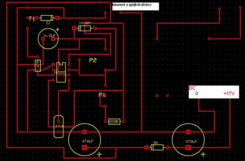 Tökéletesen beált, bár igaz hogy kb 1 sec alatt 2 impulzus van de ez így jó. A rajzot kicsit át kell tervezni ezen alkatrészek alapján. Ha lesz egy kis időm fölteszem az új tervet, hátha kell valakinek. Már csak azt lenne jó tudni mekkora fesz jön ki belőlle. A szekunder oldalon kb 25-30 ma mérek. Mivel csak digitális műszerem van azzal még osztón keresztül is nehéz megmérni. Esetleg erre van valakinek ötlete?