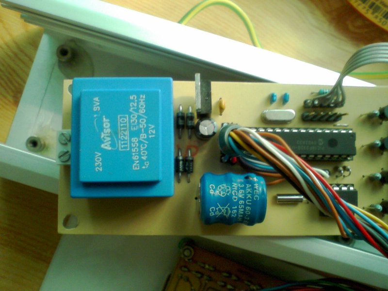 van egy lent majdnem az akkumulátor mellett, és van egy közvetlenül a Stab Ic után mindegyik 100nF-os. az MCLR láb 10K-val tápra van húzva! annyi hogy ami van szalagkábel ráforrasztva az kivezeti az ICSP csatira a programozó lábakat! de itt már az icsp csatin nincs külön szűrés. és egy jó 20cm hosszú a szalagkábel!