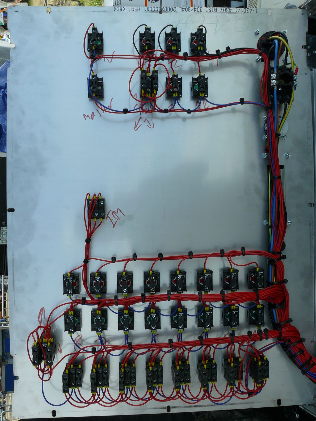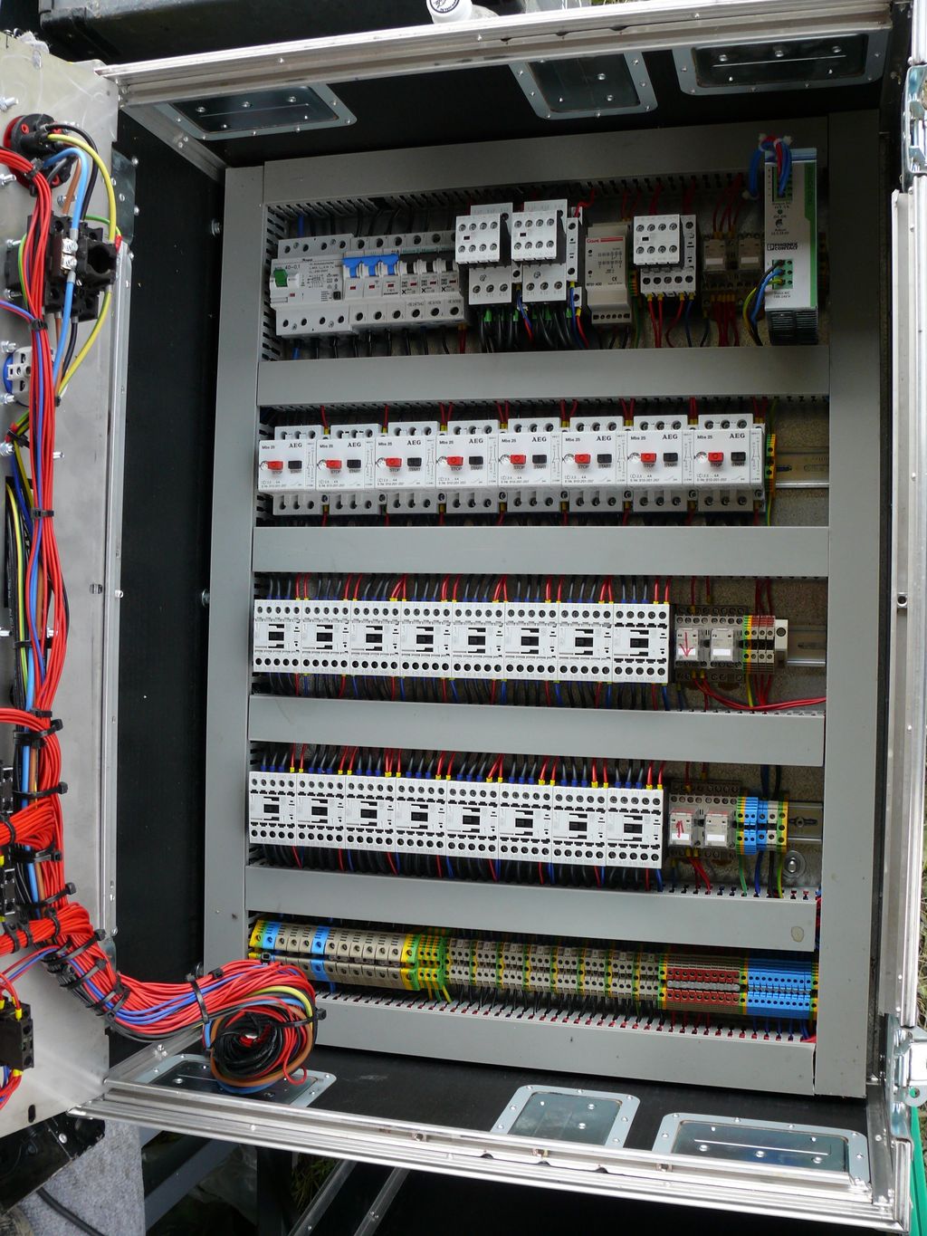 Főbb jellemzői: - 3x32A bemenet, EV relével, kismegszakítókkal, 24pólusú HARTING ipari gyorscsatlakozó kimenet. - Fázis sorrend figyelés-fordított sorrendnél a bekapcsolás tiltása - Fázissorrendváltás mágneskapcsolóval - Többkörös vészleállító kapcsoló - Mind a 8 motornak külön mágneskapcsoló mindkét irányba, ill. motorvédő, melyek állapotát az előlapon visszajelzi. - 24V DC vezérlés - Lézervágott és gravírozott előlap rozsdamentes lemezből, professzionális szállítókonténer, ipari kapcsolók és kezelőszervek. Érdekesség, hogy bár több száz méter kábel van benne, kapcsolási rajz nem készült ( Lustaságom okán ) és csak egy elkötés volt benne, a segédrelé ami a mágneskapcsolókat húzza, na az volt elkötve.( 2 db van benne, hogy ne lehessen egyszerre a le és fel irányokat aktiválni, így szembeküldeni a fázisokat a két mágneskapcsolóra.)