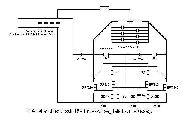 Az is gond a Royer oszcillátorral, hogy elég problémás az indulása. Szép nagy lengések vannak a bekapcsoláskor, aztán persze ezek csillapodnak és beáll a stacioner állapot. Erre mondtam, hogy az 1200 V-os IGBT-k ezt nem fogják kibírni. Persze, erre is van megoldás, de már annyira megbonyolítja az egészet, hogy elvész a kapcsolás szépsége: vagyis az egyszerűsége. Az is egy jó megoldás lehet, ha van előtte egy buck konverter, aztán lassan nő a betápfesz, akkor nem lesznek számottevő tranziensek. De akkor már olyan bonyolult, hogy egy félhíd, vagy teljes híd egyszerűbb.