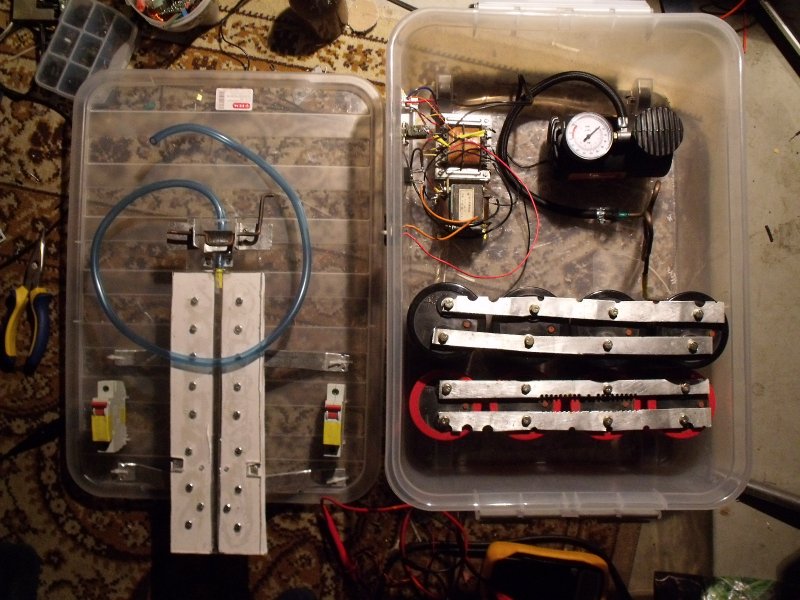 Valamint kicseréltem a köpenyeket rézre. Ezekről most nincs képem. De közben folytattam a coilgunomat is. A kicsi kondibankom, a kb. 5000µF és 350V-ra töltve ami már 309 J-s. Nem tirisztor használok, számomra elérhetetlen, de néhány héttel ezelőtt készíttetem egy nagy teljesítményű kapcsolót. Természetesen védem a kondibankot diódával. Egy kép a kapcsolóról.