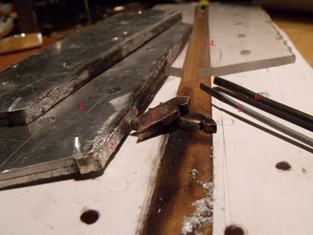 Az alábbi képen számokkal jelöltem hogy mi micsoda. 1. fősín, ez az egyik legfontosabb alkatrész 2. köpeny, könnyen cserélhető és jó ha nem alumíniumból kiszül 3. Lövedék, a végén V alakú kialakítás, az elején a bevágás a kihúzó pálcának. 4.A gyorsítószakasz sín. 5. Kihúzópálca, a lövedék kiszedéséhez, vagy megigazítására szolgál. 6. Betöltő pálca, 2.5mm vastag acél Én így oldottam meg a sínt, de valószínű hogy továbbfogom fejleszteni.