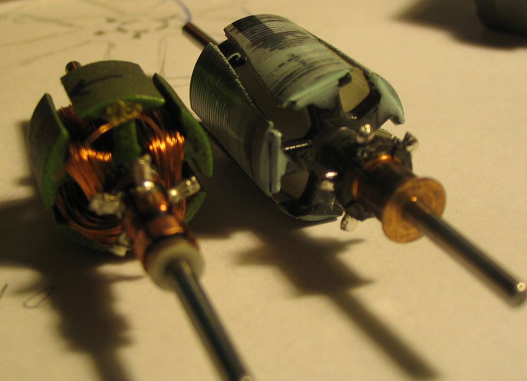 Adott két DC kefés kismotor (modellvasút). Az egyik újkorában se nagyon akart forogni, csak melegedett. A másik jól ment, de teljesen elkopott a kommutátora. Azt elkezdtem letekercselni, hogy kiismerjem a tekercselés irányát, és menetszámát. 110 metet van 1 tekercsen, és 0.2mm a huzal. (0.25 zománccal mérve, ebből gondolom hogy 0.2 lehet) A másik motoron azt vettem észre, hogy a kommutátor nem úgy állt a a vas szegmenseihez képest mint a másik, lehet hogy ezért nem működött. Ezt sikerült beforgatnom úgy, mint ahogy a másik, hajdanán működő motoron áll. A kérdésem az lenne, hogy nincs itthon csak 0.1mm es huzal. Próbáljak két szálat összefogni ? Ez a vas hosszabb is mint a másik, erre vajon mennyi menet kellhet ? (Ezt már korábban szétszedtem, és már áttekercseltem egyszer, de csak most tűnt fel a kommutátor elfordulás, szóval már nem tudom mennyi volt a gyári menetszám)