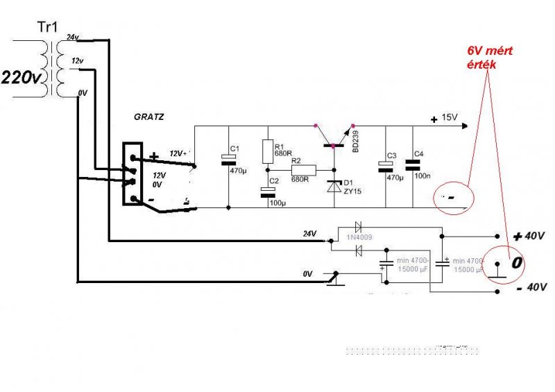 bocsi ezt benéztem igazad van a gretz kimaradt és egy dióda van helyette betéve . Azt a félhullámos dolgot nem igazán értem ( de lemértem van 15V és 2*40V-om a Gnd-hoz viszonyítva . és az erölködőt már el is indítottam és jó)