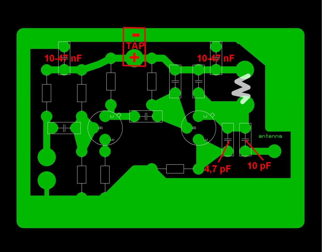 Szerintem ez elindulhat ha kap egy jo fele tranzisztort az oszcillatorba. Tettem ket kondit kb10- 47nF a tap agba, es egy kicsatolo kondit az antennara kb 10 pf , hogy ne huzza el az antenna annyira. Persze meg jatszhatsz meg a tervvel, de jo esellyel ez igy mukodhet is, csak a vegtranzisztor tipusara figyelj. Ha ezt epitenem elso korben BC182, BF199 parossal probalkoznek. Ha valakinek lenne epito jellegu hozzaszolasa ehhez konstrukciohoz , kerem ossza meg velunk hogyan lehetne RF szempontbol ez a nyak jobb. Udv Joe