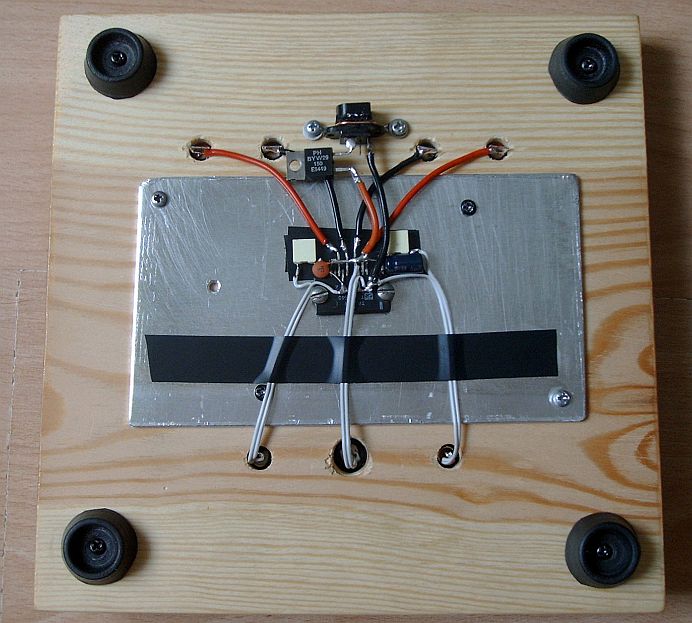 Nincs is megreccsenve a deszka... meg ugyan jol tulelte az alkotoi rohamomat... Egyelore egy dugasztaprol megy, semmi brumm vagy ilyesmi, holnap osszedobok neki egy jobb tapot. Nem akartam ratenni a trafot es a tapot, hadd legyen abszolut lapos es letiszult. Meg a bekapcsolasjelzot is banom mar rajta kicsit...