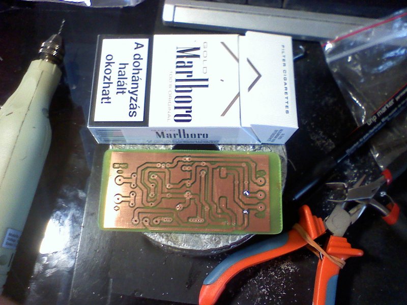 Nem is mondtam.... A monitor tévének az volt a baja, hogy a kapcsolója elájult és az csinálhatott valami galibát, viszont a 7812 stabkocka nagyon melegszik, szinte tüzes. Rámértem a tápjára és 19,2v jön ki belőle. nem sok az kicsit a 12voltos stabkockának?? (vagy lehet, hogy a kocka elé kéne valami ellenállást raknom, hogy ne 19volt nyúzza a kockát, hanem mondjuk 15!!) Más. Ma a nyákot sósav és hidrogén/oxid krém kevezékjében marattam, és utának autó fényezéséhez használatos lakkal fújtam le és csodálatosan szép lett. Néztem ezt a nyák lakkot de nagyon drága, viszont az autóhoz használatos lakk 800ft és szerintem pár hónapig tuti elég lessz. és tejesen szigetel, nincs áthúzás.