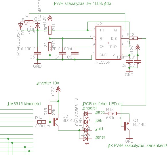 A lényeg: LM3915-re kötnék egy közös anódos RGB LED-et (tehát kell egy invertáló a LED-ek elé, mert eredetileg a LED-ek katódját kellene a kimenetre kötni), plusz egy fehér LED anódját. Ezeknek a LED-eknek az anódját vezérelné az LM3915 után lévő inverter, a katódjára pedig színenként raknék egy-egy, tehát összesen 4db PWM vezérlőt. Ezzel azt érem el, hogy külön szabályozhatom a színek fényerejét, azt pedig, hogy melyik LED világit, az LM3915-re bízom. Ebből lesz egy kisebb VU-Tower. Ez az alapfelállás. Még annyit változik szerintem a kapcsolás, hogy az RGB és fehér LED-ek duplázva lesznek, tehát a vezérlő eszközt úgy kell megválasztanom, hogy bírja a megfelelő áramot. Tudnátok hozzá ötleteket adni, hogy helyes-e az invertáló kapcsolás, és a PWM vezérlés összehozása? Esetleg FET-et használjak-e? Vagy meglehetne-e oldani szebben ezt a részét a kapcsolásnak? A kapcsolás még vázlatos, ezért kérlek, úgy nézzetek rá! Köszönöm szépen!