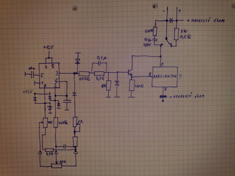 Elnézést a késői válaszért. A hiányzó alkatrész adatokról: az összes dióda 1N4148 A meghajtó tranyó BC301;vagy BC182,bármilyen NPN kapcsolótranyó megfelel. A végtranzisztor BDV65C az eredeti kapcsolásban, az IC 2;6;-os lábán levő kondi jó minőségű 100nF-os tantál vagy hasonló kis szivárgóáramú típus. Még annyit talán, a főtrafó kikapcsolását a motorhoz képest néhány tized másodperccel késleltetni kell,mert egyébként a huzal odaragad a hegesztendő anyaghoz. Ezt a problémát az eredeti kapcsolásban megoldották diódás kapuzással(D18) és egy kis elkó beiktatásával a főáramú kontaktort vezérlő relé tekercsével párhuzamosan kötve(RL02 relé tekercséval párhuzamos rész). A relék tekercsfeszültsége nem kritikus, akár 12V-os is lehet, rermészetesen akkor a relék "+" lábai nem +24V-ot,hanem csak +12V-ot kaphatnak.Az ütemadó IC akár el is hagyható, ebben az esetben a T3 tranzisztor helyére kell a pisztolygombot kötni,és így vezérelni a reléket. Ezt a kapcsolást már több példányban elkészítettem,mindegyik elsőre indult,bár volt ahol az 555 IC 2;6; lábán levő kondi értékét csökkentenem kellett,hogy nagyobb kapcsolási frekvenciát érjek el,mert a motor pont az eredeti kapcsolás frekvenciáját nem szerette. Sok sikert az építéshez.