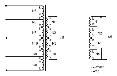 A 4-4 kivezetés pedig azért van, mert osztottan szokás tekerni a kimenőket, így a szekundered 4 tekercsből áll: ezek rend szerint így néznek ki, hogy 8Ω-hoz sorba kell kötni mindet, 4Ω-hoz a két szélsőt sorba, a két középsőt sorba, és ezt a kettőt párhuzamosan kötöd… Ehhez meg kellene keresni az elejüket és a végüket… Egy sima ellenállásmérővel meg tudod ezt állapítani, hogy melyik hány ohmos. (persze nem biztos, hogy az előbb leírtak alapján van tekerve, de ez az általános - ha így van, akkor 2Ω-osaknak kellene lenniük) Idézet: Ez így ebben a formában nem igaz. Ha a 4 szekundert sorba kötöd, akkor 16 Ohm (akkor, ha vegyesen kapcsolva 4 Ohm ), számolj utána, az összefüggés nem egyenesen arányos.„ezek rend szerint így néznek ki, hogy 8Ω-hoz sorba kell kötni mindet, 4Ω-hoz a két szélsőt sorba, a két középsőt sorba, és ezt a kettőt párhuzamosan kötöd…” Idézet: „Egy sima ellenállásmérővel meg tudod ezt állapítani, hogy melyik hány Ωos. (persze nem biztos, hogy az előbb leírtak alapján van tekerve, de ez az általános - ha így van, akkor 2Ω-osaknak kellene lenniük)” Na ez aztán tényleg butaság. Kit érdekel, hogy mennyi a tekercs egyenáramú ellenállása? Lehetőleg minél kevesebb, és - reméljük - jóval kisebb, mint amit a DVM-el korrektül mérhetne. Ne adj használhatatlan, vagy félrevezető tanácsokat.