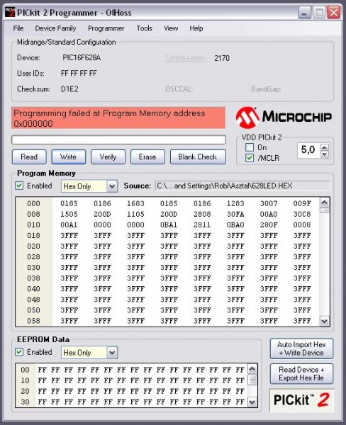 Üdv. Pickit2 klónal (szilva féle) szeretnék programozni 16f628-at. Fel is ismeri a pickit 2. De ha beinportálom a hex fájlt és rákattintok arra hogy write akkor a végén kiír egy hibaüzenetet (lásd a mellékelt képen). Ez miért van?