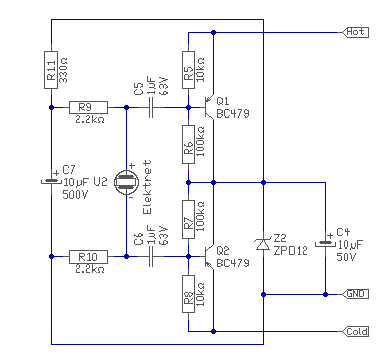 Tekintve, hogy engem is érdekelt amit felvetettél, kicsit körülnéztem és találtam ezt az oldalt. De mivel elég bénák a rajzok, lerajzoltam. (Én is nézegettem egy darabig, míg rájöttem mi micsoda.) The 1u0 capacitors should be high quality plastic film types." A kondikra azt írják jó minőségű film kapacitás kell. De az első estnél a 10µF elég szép darab lenne. Így szerintem bonyolultabb, de jobb a tranyós. Tranyónak, persze más kis-zajú PNP is megfelel. A kapszula negatív háza, most nem lehet a földön! Tehát el kell szigetelni.. üdv! proli007 |