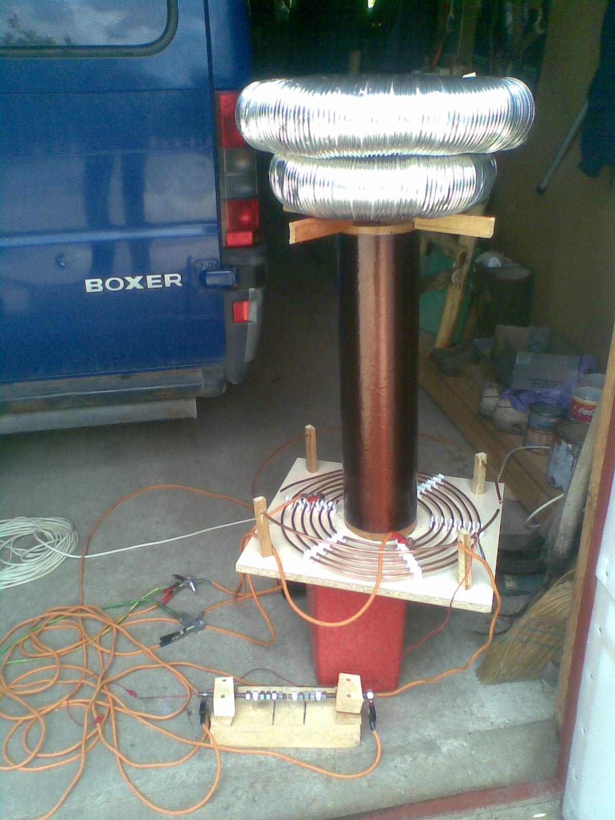 A másik, hogy ekkora kábeldzsungel esetén még akkor sem biztos, hogy működne, ha ki lenne hangolva. Rövidítsd le a kábeleket, amennyire lehet. Ha pedig szeretsz fával dolgozni, és vannak szerszámaid hozzá, miért nem csinálsz egy normális állványt neki? Hidd el, sokkal kényelmesebb dolgozni, ha legalább egy polc rendszerben kialakított fa állványra van téve minden, rövid kábelekkel. A tetőkapacitásra pedig vigyázni kell, mert az ilyen benyomódások hatására drasztikusan lecsökken a maximális feszültség. Ja illetve még annyit, hogy majd ha már végső teszteknél tartasz, cseréld le vörösréz sarura a krokodilcsipeszeket, és minden ilyen csatlakozási ponton használ sarut.