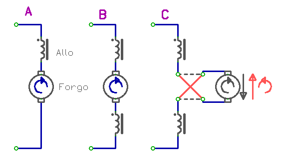 Nem ismerem a motorodat, de megpróbálom egyszerűen elmagyarázni. Ehhez készítettem három ábrát.. - Egy soros főáramkörű (vagy univerzális) motor, egy állórész tekercsből és a kommutátorokon keresztül kivezetett forgórészből áll, mint az "A" ábrán látható. - A forgásirányát, az álló és forgórész egymáshoz viszonyított áramiránya határozza meg. Ha ez fordul, akkor a forgásirány is fordul. (Hiszen az áram iránya, meghatározza az elektromágnes által keltett mágneses tér pólusát is.) - Ezért, a motort lehet egyen és váltó feszültségről is járatni. Mert ugyan a váltó feszültség áramiránya, másodpercenként 50-szer megfordul, de az álló és forgórész egymáshoz képesti áramiránya nem fordul meg. - Az állórész fizikailag általában nem egy, hanem két tekercsből áll, mint ahogy a "B" ábrán látható. A tekercsnél látható kis pötty, a tekercselés kezdetét mutatja, pont abból a célból, hogy az helyes áramirány szerint tudjuk sorba kötni a kettőt. (Erre hívta fel a figyelmet a pdf) Ha az állórészt rossz tekercsiránnyal kötnénk össze, akkor azok (szembe kapcsolva) lemágneseznék egymást, és gyakorlatilag váltóáramon zárlatot mutatna, mikor ráadjuk a feszültséget. A motor megállna, mert az állórész gerjesztése nulla lenne, a forgórész meg gerjesztve lenne. Csak hogy nem lenne egymáshoz képesti viszony. - A "C" ábrán látható, hogy a forgásirány hogyan változtatható meg. Ha a kommutátorra menő két (állórészvég) vezetékét lekötjük, és a kommutátorra "keresztbe kötjük" vissza, akkor megfordul a forgásirány. A régi bekötést, a fekete szaggatott vonal mutatja, a fordított bekötést, a piros vonal. - A forgásirány váltásához, gyakorlatilag ezt a keresztkötést kell megvalósítani a kapcsolóval. Tehát kell egy két-áramkörös kétállású kapcsoló. Ezzel el lehet végezni a polaritás váltását. De mivel Te gondolom nem kapcsolóval, hanem relével szeretnéd váltani a forgás irányát, így két relé alkalmazása szükséges, amivel egyúttal a ki be kapcsolást is meg lehet valósítani. pld. SR1 húz, jobbra forog. SR2 relé húz, balra forog. Egyik sem húz, motor áll. Mind kettő húzását vagy meg kell akadályozni logikailag, vagy úgy kell bekötni. hogy ilyenkor is álljon a motor. A kondi és az ellenállás (RC), a zavarszűréshez szükséges, de esetleg a fordulatszabályzó triac-os áramkör helyes működéséhez is szükség lehet rá. Célszerű a kondit nem 1kV-osra választani, hanem Y2 típusú kimondottan hálózati feszültségre készült "öngyógyulós" kondit választani ami nem egyenfeszültségű, hanem ~275V váltófeszültségű típus. Az RC zavarszűrő tag, olykor egy kondinak látszó tokban is kapható. üdv! proli007