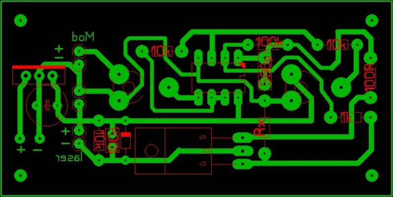 Ha a rajz szerint ültetted be akkor van egy kis hiba, ha jól látom a FEt Gate lábára megy az 1k-s ellenállás (eredetileg oda 100ohm) Az RX ellenállás is a Gate-ra megy amikor a source-ra kéne, esetleg ha a kapcsolás szerint ültetted be az alkatrészeket, akkor a FEt-et fordítsd meg