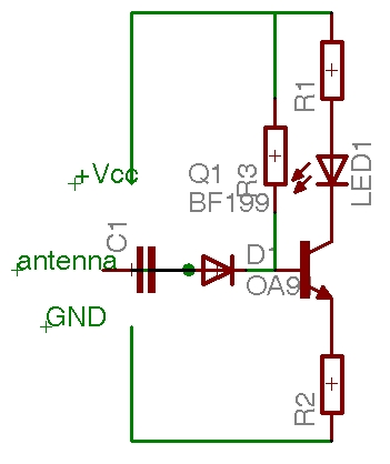 Hali! Műveleti erősítős megoldást nem javaslom, mivel nem bírja a nagyfrekvenciát. Próbáld meg ezt a kapcsolást, ha csak egy darab drótot használsz antennának. Nem tudom konkrétan milyen oszcillátort építettél, de gondolom van az antenna kimeneten egy trimmerkondenzátor. Tehát rákötöd az áramkört az antenna helyére, a másik felét pedig a testelésre (GND) és addig hangolod, míg a led a legfényesebben nem világít. A D jelű dióda régifajta germánium dióda legyen. például az OA sorozatból. A led helyett tehetsz érzékeny deprez műszert is. Ha rendes frekvenciára hangolt antennával használod az adódat, akkor javaslom, hogy egy mérőhíddal hangold ki.