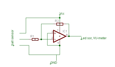 Arra gondoltam, hogy fogok, egy ilyen hall szenzort (mágneses térerősség mérő IC) és mérem vele a térerősséget. Egy műverősítőre ráviszem a szenzorból kijövő jelet, és a műverősítő kimenetét egy ledsorra , VU-meterre teszem.