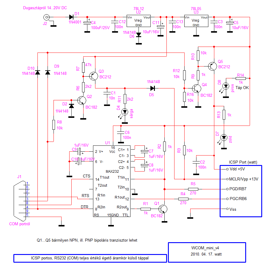 Azt hiszem két malomban őrlünk... Nem a 78L05-öt szeretném megvédeni, hanem a pic-et. Egy esetlegesen hibásan összerakott (74LS07 nem kap tápot) vagy alacsonyabb fogyasztású eszközzel megvalósított meghajtóval felépített programozóban a Vdd feljebb mehet, mint 5V, ha nincs elég fogyasztás rajta. ICSP alkalmazása esetén, mivel nem csak a pic fogyaszt a Vdd-ről, nincs probléma. Egymagában programozva már nagyon a határon van, ha a 10k nem egészen 10k, már kimegy a 7805 a specifikált tarományából. A különböző gyártóktól származó 78L05 példányok szórhatnak... Javaslom a LED beépítését: egyrészt állandó mA nagyságú fogyasztás lesz a Vdd-n, másrészt a programozó működése (kezdők számára) követhetőbb lesz.