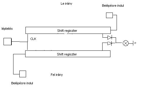 Mindkét irányra egy egy shift regiszter a lépcsőfokoknak megfelelő hosszban.A bemenetre egy időzítő ,ami a maximális világítási hosszt állítja be (mindkét irányhoz egy egy) Ez adja a shift regiszter bemenetét.Ezenkívül egy időzítő ami a mozgás ütemének megfelelően lépteti a bemeneti időzítő jelét.Amíg a bemeneti időzítő megy addig '1' et léptet be ha letelt '0' ugyan olyan ütemben.Ha mindkét irányból jönnek mindkét ciklus teljesen lefut a kettő közös eredménye látszik .Ha visszafordulnak adott idő után törlődik az egész.