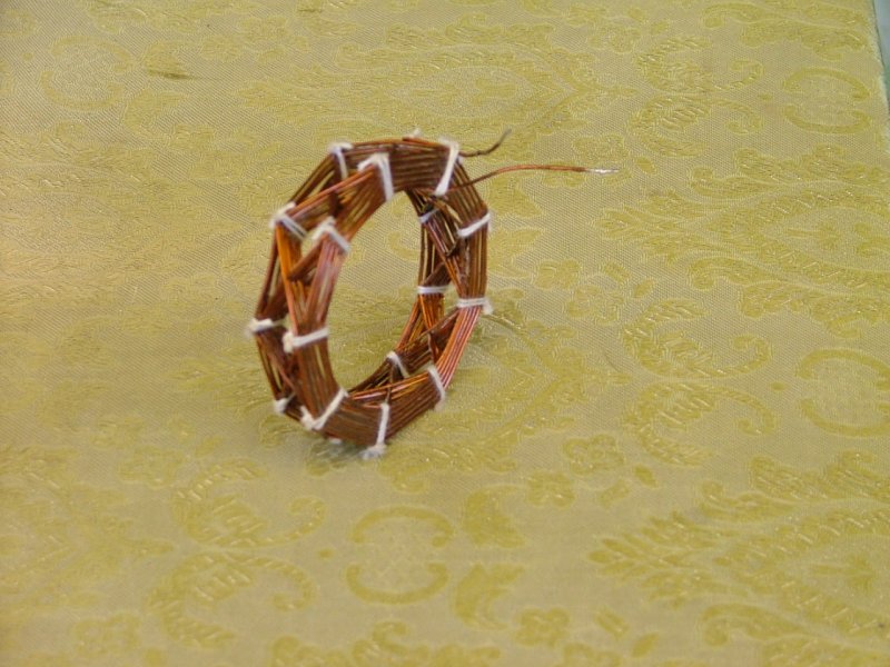 Az elkészítéshez esztergáltam egy darab fát 50 mm.-re,rájelöltem a kerületére egymástól 12 mm-re két kört, amit 9 egyenlő részre osztottam.Körönként 9 szeget beütöttem és az így kialakult csillag sablonra 0.7 mm-es zománchuzalt tekercseltem 12 sorba egymás fölé.A tekerés módja:a kezdet után 2 szeg mellet elhaladva át a másik sorba, ismét 2 szeg után vissza, 2 szeg és át....és így tovább.A mellékelt képeken látható a sablon és a kész tekercs.Miután a tekercs elkészült lekentem színtelen lakkal 2 rétegben.Száradás után a szegeket ki húztam és óvatosan a tekercs első sorát terhelve leválasztottam a tekercset.Ha a lakk túlságosan megszárad, a tekercset nem tudjuk levenni, mert ráköt a sablonra. A rádióban lévő tekercs adatai:kis átmérő 40 mm.nagy átmérő80mm.szélesség 12 mm. osztás szám 9 .Felrakott sorok száma 26.