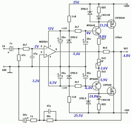 LT 1028-al hasonló feszültségeket kéne mérned mint ami a rajzon van, a negatív ágban szinén, néhány tized V eltéréssel.