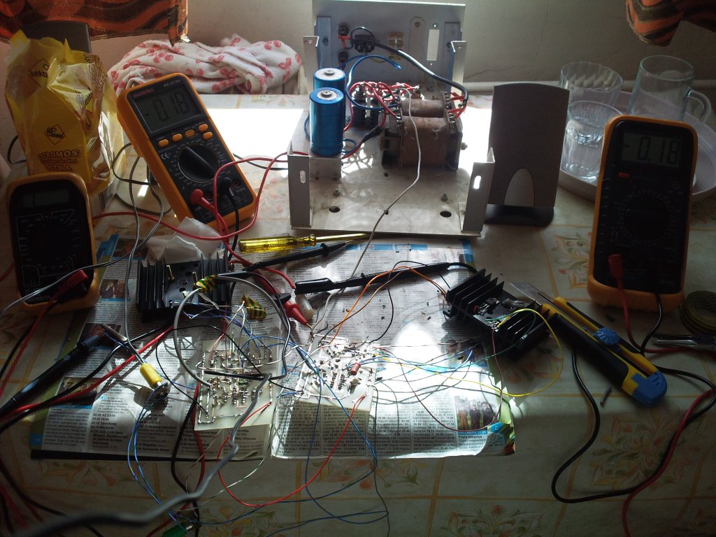 Ma lettem kész a 2x30W os erősítőmmel.Doboza már meg van de még nem építettem be, egy régi orosz music centernek volt a trafója abból van a táp kb 2x22V ad le pufferolás után, 2db 10000µF es elkó van bent. Megosztok veletek 1-2 képet, majd ha bedobozoltam akkor is teszek fel képeket.Remélem szívesen fogadjátok. Üdv Tibi