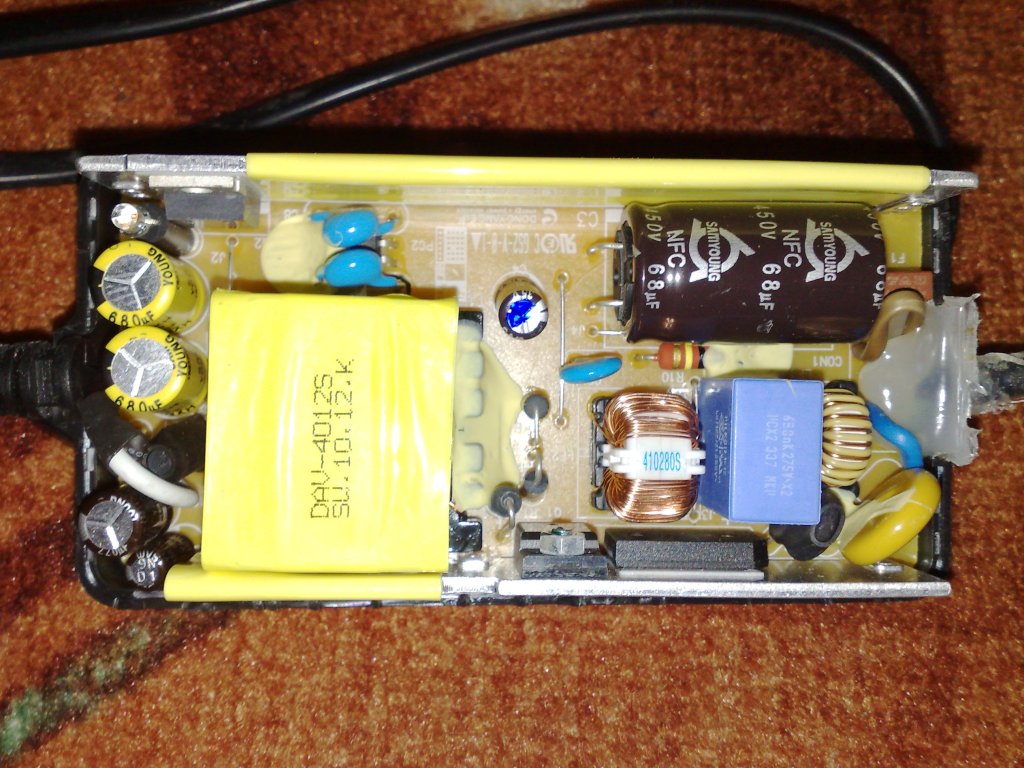 Addig eljutottam hogy találtam egy régi kis rádiót ami 9 V-os elemről illetve 9 V-os trafóról ment.A trafóját kikaptam meg volt a 9.5 V váltó áram.Rátettem a kütyüt és halk zúgás illetve halvány kék szín volt látható.Érezhető volt a szag.De mivel 12 V-ot ír az adattábla így tovább kutakodtam (sajnos rosszul emlékeztem a hifi táp 24 V a legkisebb fesz) találtam a mellékelt képeken látható tápot.Bár elég bonyolult a felépítése,főként a forrasztási oldal (tele van pici IC-vel) de ezt is meglehet buherálni hogy váltó jöjjön ki?Egy dologra tudok gondolni.A trafóját kikapom és ennyi.Úgysem tudom mire használni mert szakaszosan üzemel.Pl.:kis izzó,villanymotor szaggatottan ment.