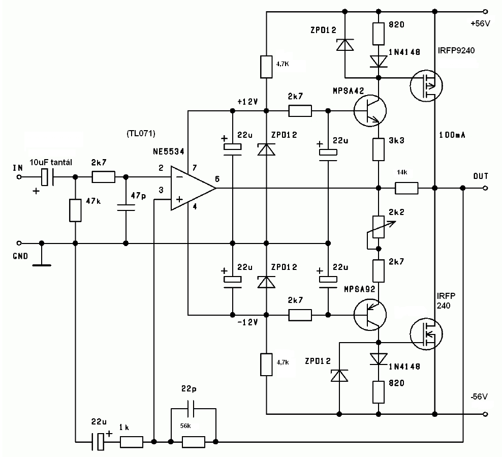 Már többször is elolvastam a forrásoldalt. Amit elfelejtettem mondani... hogy én -IRFP240 és IRFP 9240-t használtam az áramkörben - 2x42 voltról megy -és működik rendesen, szól szépen, erősít... -Ja és 48mA fölé se megy (bemenetet letestelem, kimeneten semmi sincs, de ha van akkor se megy föntebb) Azért írtam soká, mert azt hittem hogy én hibáztam valamit, és csináltam új panelt, de ezzel is ugyanaz. Viszont 540 és 9540-es párral be tudtam állítani a 100mA-t.