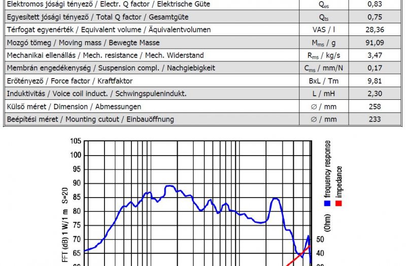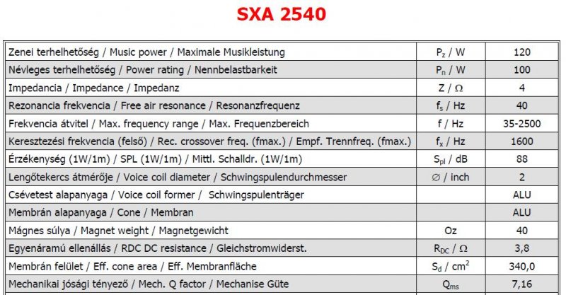 Sziasztok van egy SAL(SXA 2540) 250w 4ohm SUBWOOFEREM ehez szeretnék ládát csinálni de nagyon nem értek ezekhez a méretező programok hoz Így hát nem tudom milyen méretű ládában szólna szépen.Van hozzá még adatom nem tudom mi kell pontosan.Külső átmérő(255mm)Beépítési átmérő(253mm)Beépítési mélység(110mm)Mágnes átmérő(140mm)még ezen kívül van két képem a hangszóró adatairól nem tudom pontosan mi kell hozzá meg hogy kell.Erről lenne szó a tudnátok benne segíteni.Előre is köszönöm.