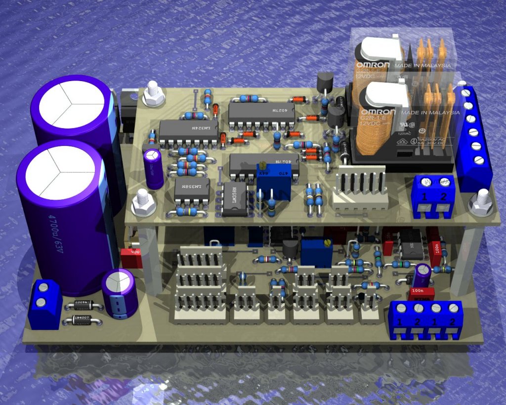 Három panelen raktam össze az egészet. A lényeg a relés panelen van. A sorkapcsokon olvasható angolul a Transformer right, middle és left. Ez a trafó három kivezetése. Az LM358 a komparált feszültség függvényében húzza meg a relét. A komparált feszültség a tápegység kimenetére van kötve. A graetz panel bemenetére megy a 'transzformátor right' és a relés panelról jövő 'Transformer switched'. A trafó az adatlapja szerint 2x10V / 40VA-es, valójában kb. 2x8 V / 1,5A.