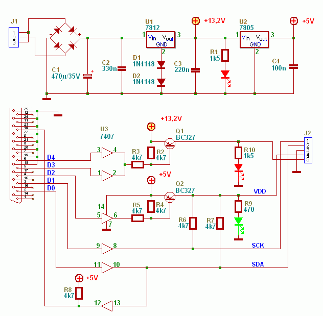 Megépítettem a mellékelt kapcsolást. Ki még nem próbáltam illetve a tápot még nem kötöttem a programozóhoz. A táppal viszont van egy kis gondom. Mindent jól kötöttem be, rámértem a 2 IC-re. A 13,2V helyett én 12,59V -ot méretem az 5V helyett pedig 4,76-ot. Tápnak egy AC/DC 12V os tápot használtam. Tettem fel erről is képet. Ennyi eltérés normális ?? Vagy talán gyenge a táp??