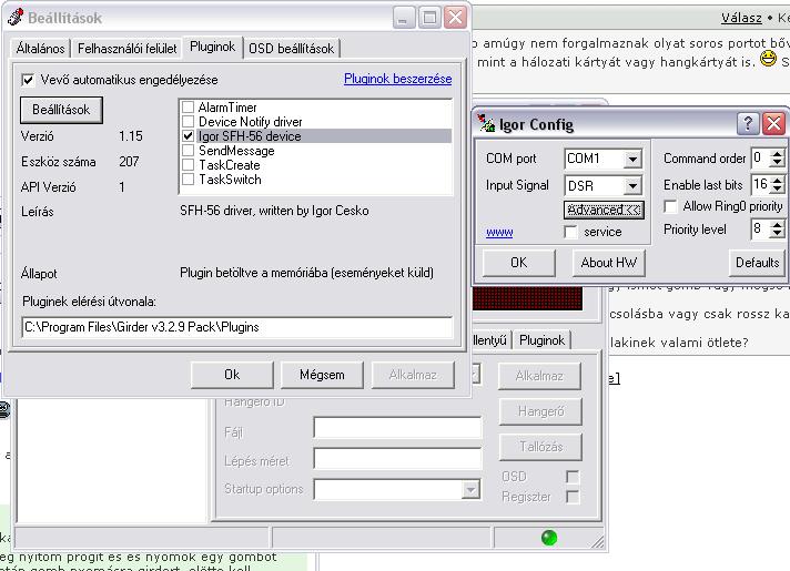Lehet,hogy én írtam félreérthetően, de akkor megpróbálom összefoglalni még egyszer; tehát adott ez a Girder nevű progi amit letöltöttem, telepítettem, beállítottam úgy ahogyan a képen látszik, plugins is stimmel most már (igor) , a letöltött winamp gml-filet beraktam a progiba, és minden egyes parancsát betanítottam egy gombhoz a távirányítón, namost bekapcsolom a gépet, automatikusan elindul a girder (így állítottam be) ha megnyomom a gombot a távirányítón, akkor megnyitja a winampot, de a többi parancsot nem tudom sehogy beállítani pl.: play stop next track stb... ezt el tudná valaki magyarázni, hogy hogyan kell? Előre is köszönöm.. Üdv.: Peti Idézet: Én ebből értettem azt, hogy valami hardveres gondod is lehet, viszont hogyha a winamp megnyitásához hozzá tudtál rendelni egy gombot, akkor mi a probléma? Főleg ha van gml file-od, ugyanúgy kell a többi parancshoz is gombot rendelni valami Learn vagy valami hasonló gomb van a girderben aztán vár gombnyomásra megnyomod, kész. Azt az egyet akkor hogy állítottad be? „ennyi az eredmény bármely gombra: FFFF”