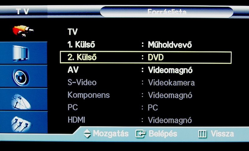 Bemenetek, amik elérhetőek: TV, 1. külső, 2. külső, AV,