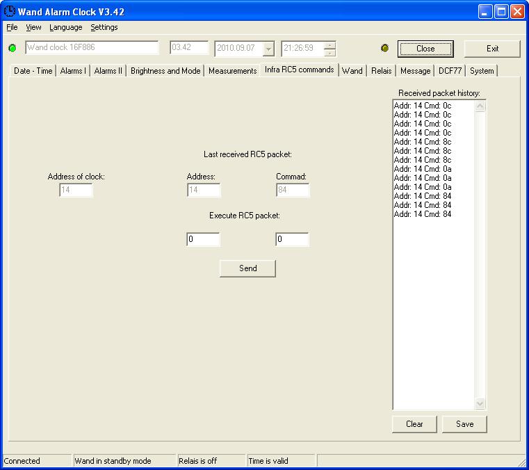 URC22 - 552 beállítás mellett RC5 kódot és TV1 - 0x00, TV2 - 0x14, VCR1 - 0x05, VCR2 - 0x14, CBL - 0x06, SAT 0x14 címet ad. A Philips -hez a 003, 026, 027, 046, 073, 113, 115, 155, 191, 192, 193, 194, 223, 266, 230, 242 TV, 278, 302, 334, 335, 336, 369 VCR, 402, 424, 425, 460, 477, 803, 830, 831, 841 SAT, 552, 553, 579, 604 CD, 559, 675 DVD, 560, 561, 562, 565, 567 AUX beállításokat említi. Az a pc-s kapcsolat itt is nagyon hiányozni fog. A Propeller bázisa vagy a Wand óra a beérkező infra parancsokat a soros vonalon elküldi a PC-nek (akkor is ha nem az órának szólt).