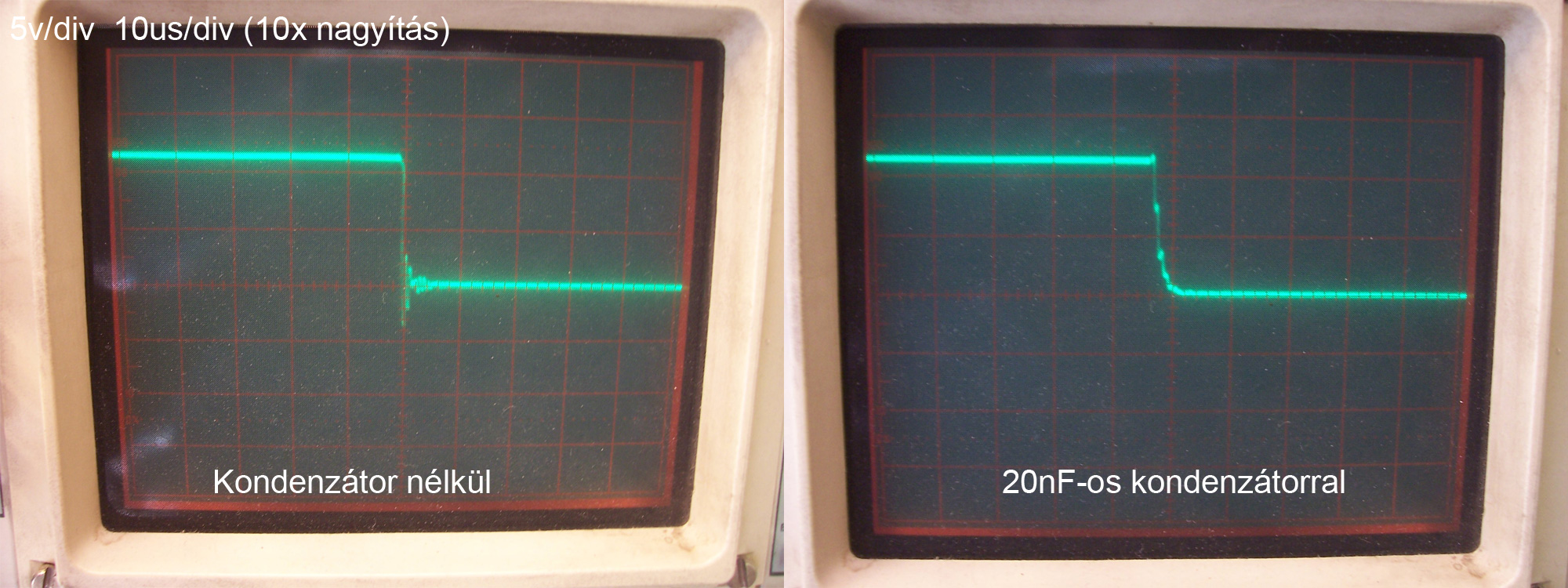 Elvégeztem a mérést egy 20nF-os kondival. Az eredményekről készült képeket mellékelem. Látszik hogy kondi nélkül hamarabb fel illetve lefut a jel. De ha rá van téve a kondi, észrevehető, hogy megnő a fel - és a lefutási idő. Mivel nem láttam ehhez hasonló méréseket itt a témában ezért nem tudom, hogy egy erősebb meghajtó trafó vagy másfajta FET mit produkálna. Így a felfutási idő nagyjából 1us és a lefutási idő 200ns. Nem a legjobb, de szerintem működnie kell vele. Igaz kicsit veszteségesen.