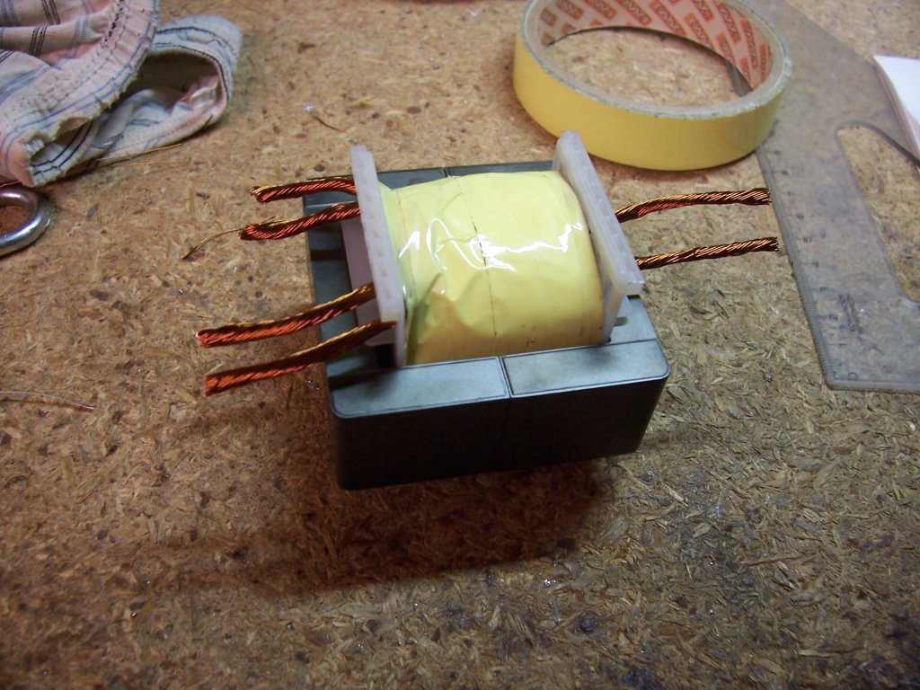 A trafó E65 -ös magra készült primer 20 menet, szekunder 6 menet. Mind kettő egy irányba tekerve. Hogy jobban elférjen, a szekunder oldalon két sodratot tekertem párhuzamosan, majd a végüket közösítettem. Melegedni nem melegszik vészesen. Hosszabb ideig tartó csesztetés után is megfoghatóan meleg. (ívfogáskor kattanás szerű hangot ad, persze nem erőset, de hallható. Kicsit sziszeg is, max álláson sípol hegesztés közben.) A fojtó U57 -es magon 12 menet litze huzal. (ennyi menetre volt elég a huzal). A tekercs egyáltalán nem melegszik rajta, a magot nem fogtam meg, de szerintem az sem melegedett. Majd még ma rámérek a gate jelekre működés közben. A videók: Teszt 1 Teszt 2